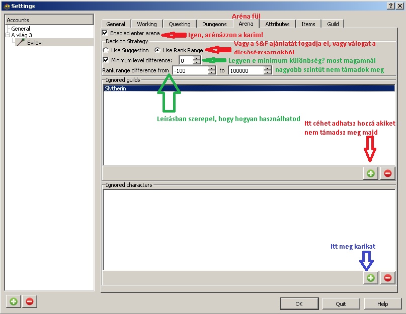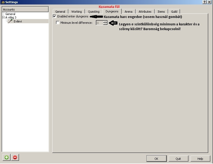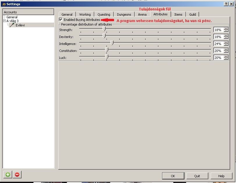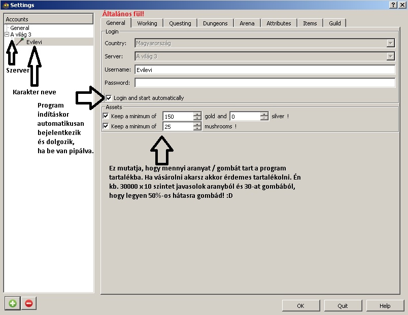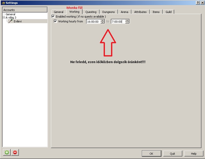 Itt azt állíthatod be, hogy mely időszakban dolgozhat a karaktered 1 órát. Amikor vége a munkádnak akkor tud a karakter Arénázni és Kazamatázni, akkor ellenőrzi a program, hogy van e kalandvágyad dolgozni és ekkor fejleszti a tulajdonságokat is. Emiatt amikor fut a bot és nincs kikapcsolva a géped, érdemes óránként dolgozni.