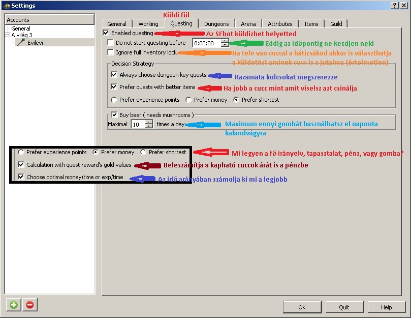 Ezzel a beállítással: éjfélkor már küldizik, így ha szintet lépek már magasabb értéken kapok munkát, erősebb leszek a harcokban, a jobb cuccok már rajtam vannak, mire felkelek és lesz pénzem reggel felkelés után vásárolni cuccokat. Kazamata kulcs küldiket elsőbbségbe teszi, a jobb cuccokat mint amit viselek megszerzi és a gombák szerzésének esélye a legmagasabb. Naponta akár 300 kalandvágyat is elhasználhat, ha van elég gomba.