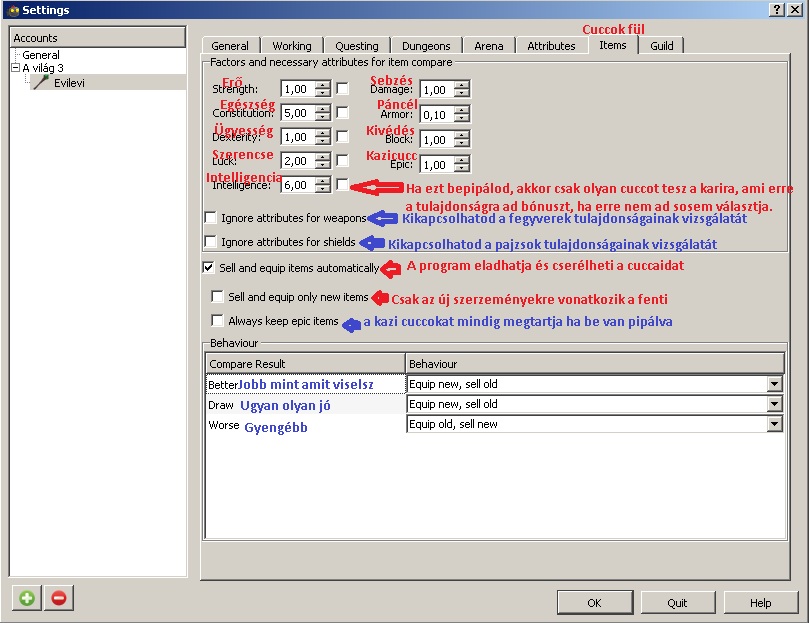 Küldikor, kazamatában cuccok eshetnek. Ez a fül arra ad engedélyt a proginak hogy a cuccaidat cserélhesse és eladhassa. Ha nem akarsz tele hátizsákot akkor engedned kell neki, hogy eladogassa a rosszabb cuccokat és dobja fel a karidra az újakat.