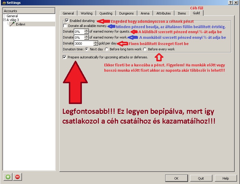 Itt beállíthatod, hogy adózzon vagy ne, mikor és hogyan. Első pipa, hogy adózzon, aztán, hogy mennyit és mit vegyen figyelembe. A 6. sor hogy mikor adózzon. Végül a legfontosabb a 7. sor! Ha semmi másra nem használod a Botot, csak hogy ne maradj le a céhkazamatákról és a harcokról, akkor már sokat tettél!